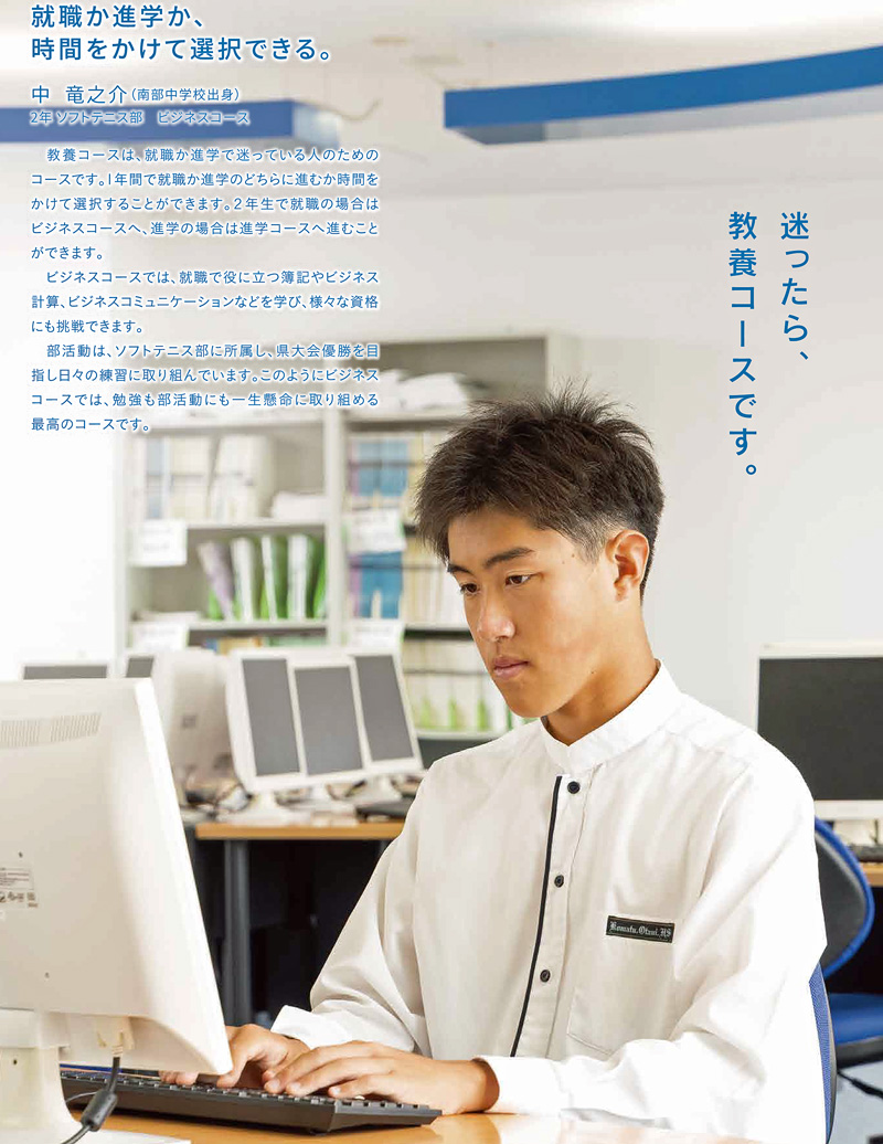 二年次からは、就職に向けて必要な知識や技能を学び社会人としての基礎を身につけるビジネスコースと、進学を目指す進学コースに分かれて、それぞれの目標に向かって学びます。